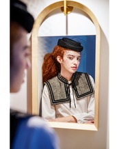 首元の立ち襟フリルは、デザイナーらしい上品さを演出され、黒ラメウールのお生地との組み合わせが素敵なデザインに。