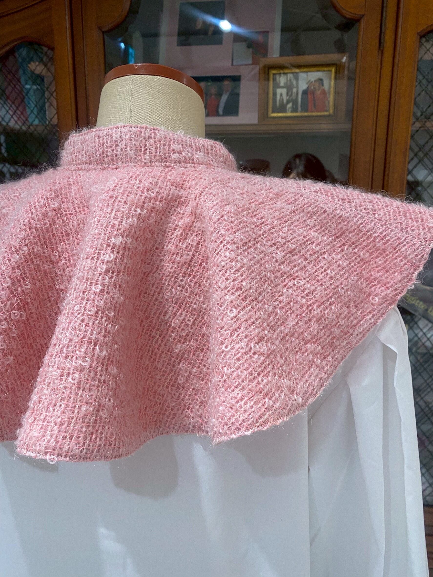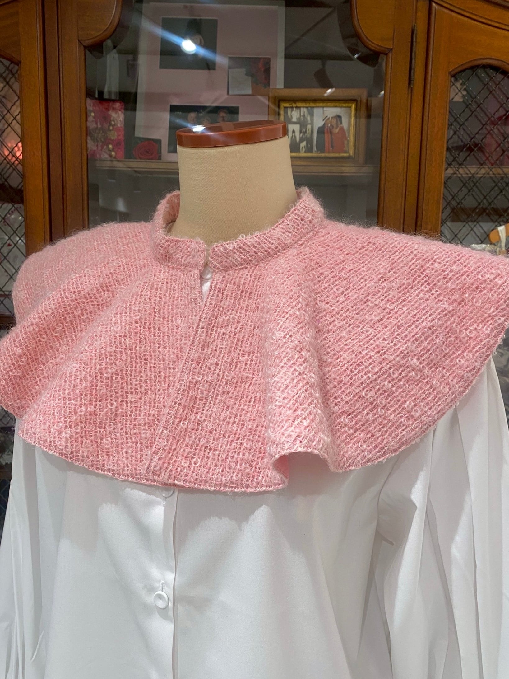 新作のツイードは、さまざまなピンクの糸で織られており、ふわふわした生地が愛らしく、華やかなお襟に仕上がりました。