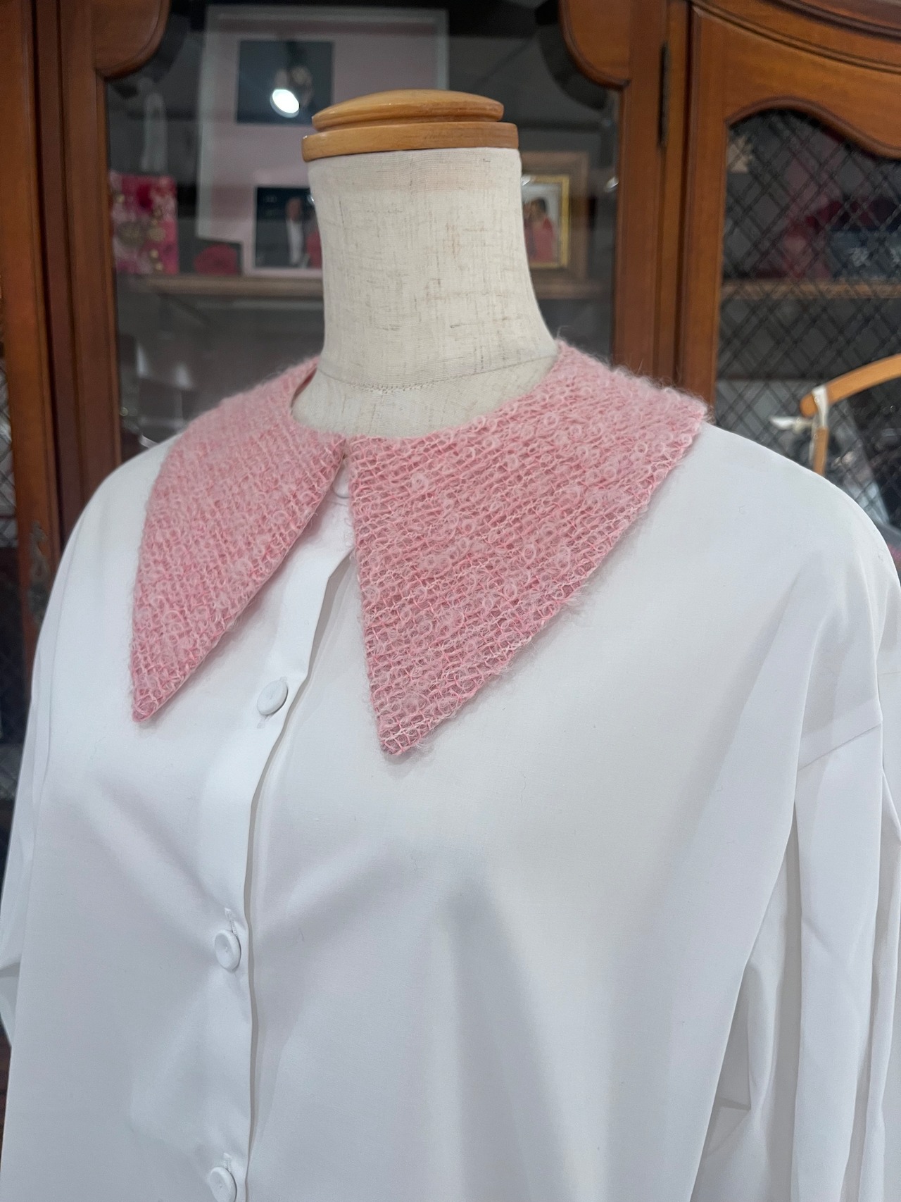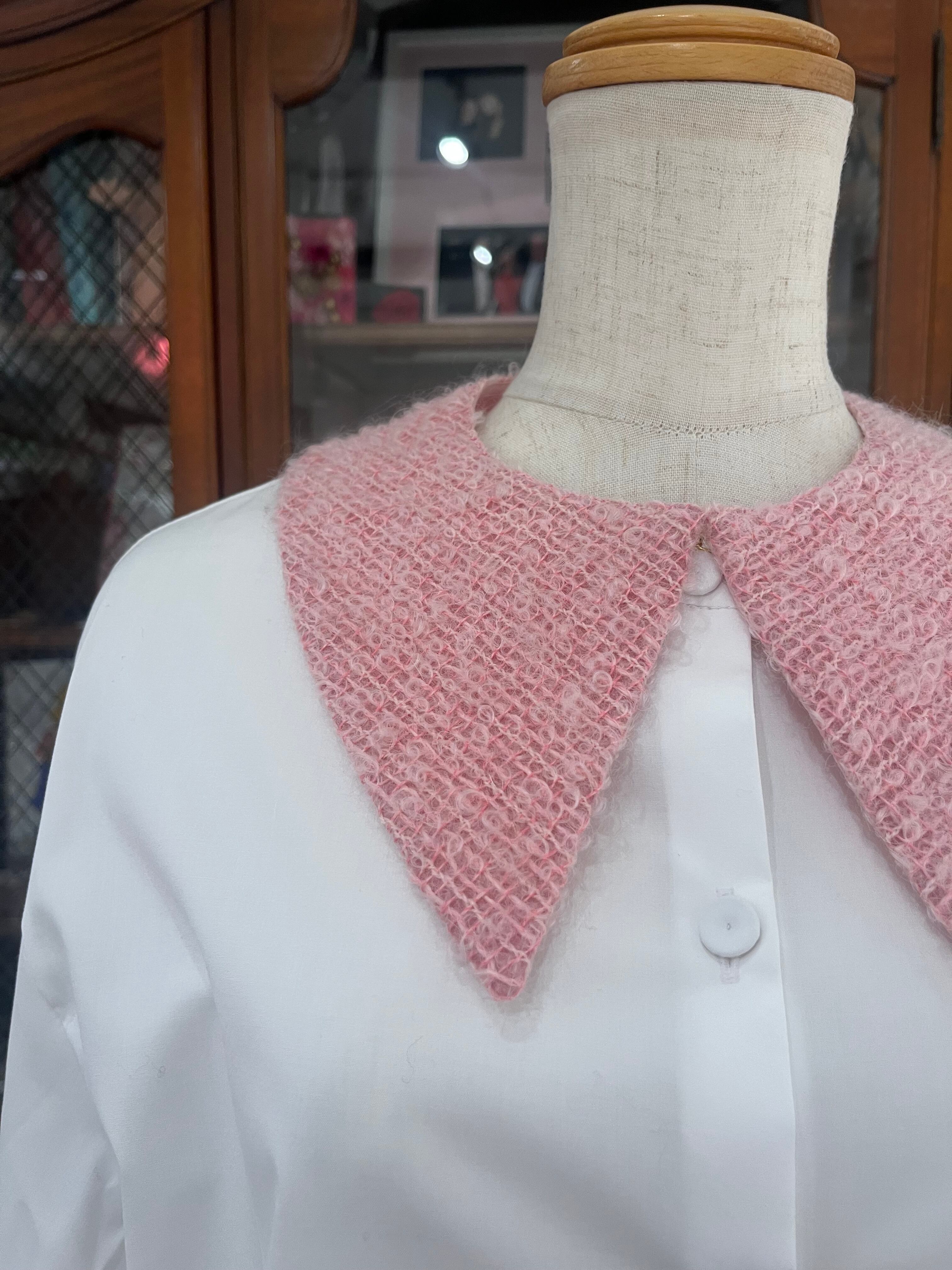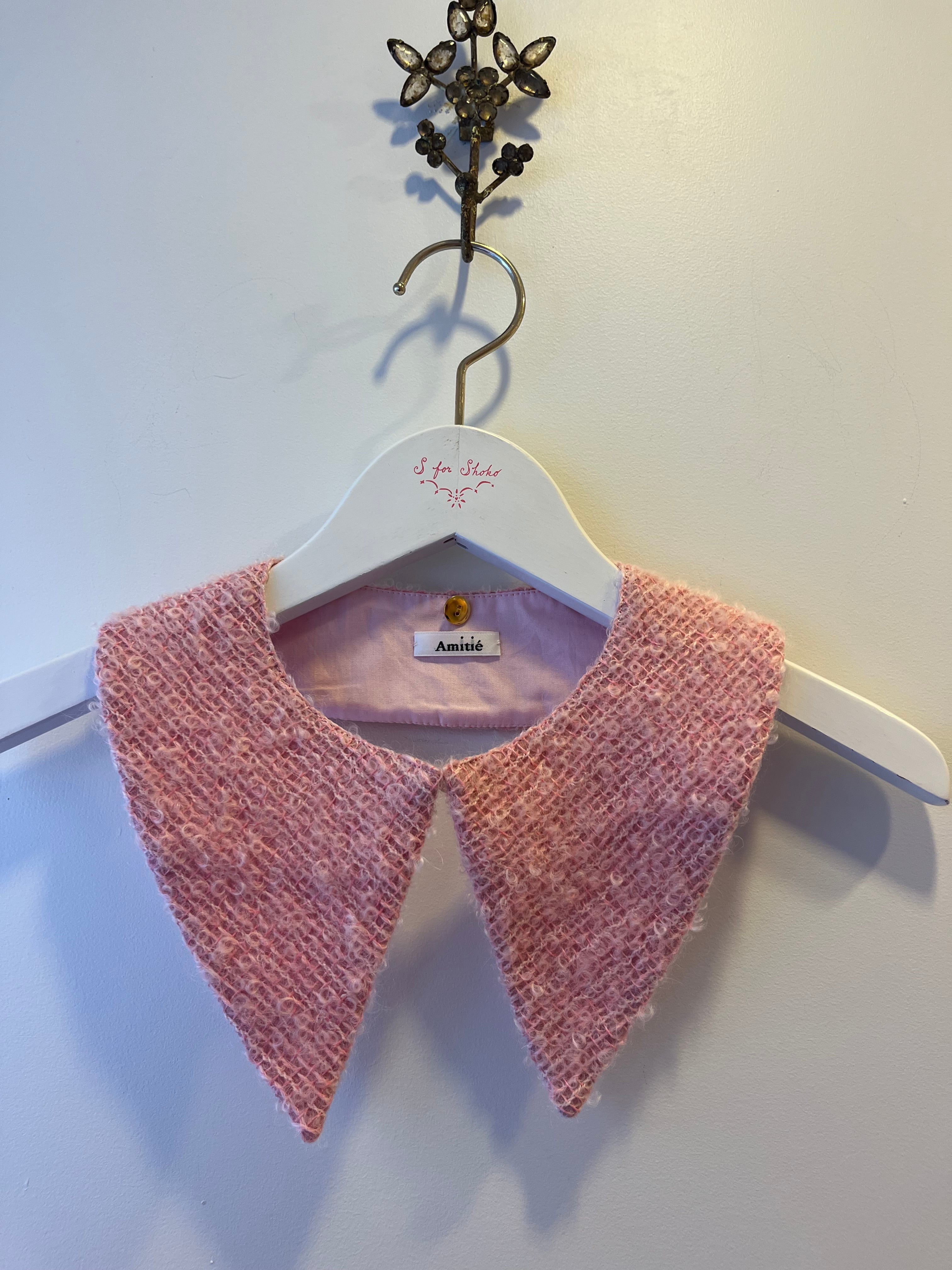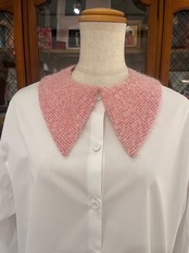 新作のツイードは、さまざまなピンクの糸で織られており、ふわふわした生地が愛らしいお襟に仕上がりました。