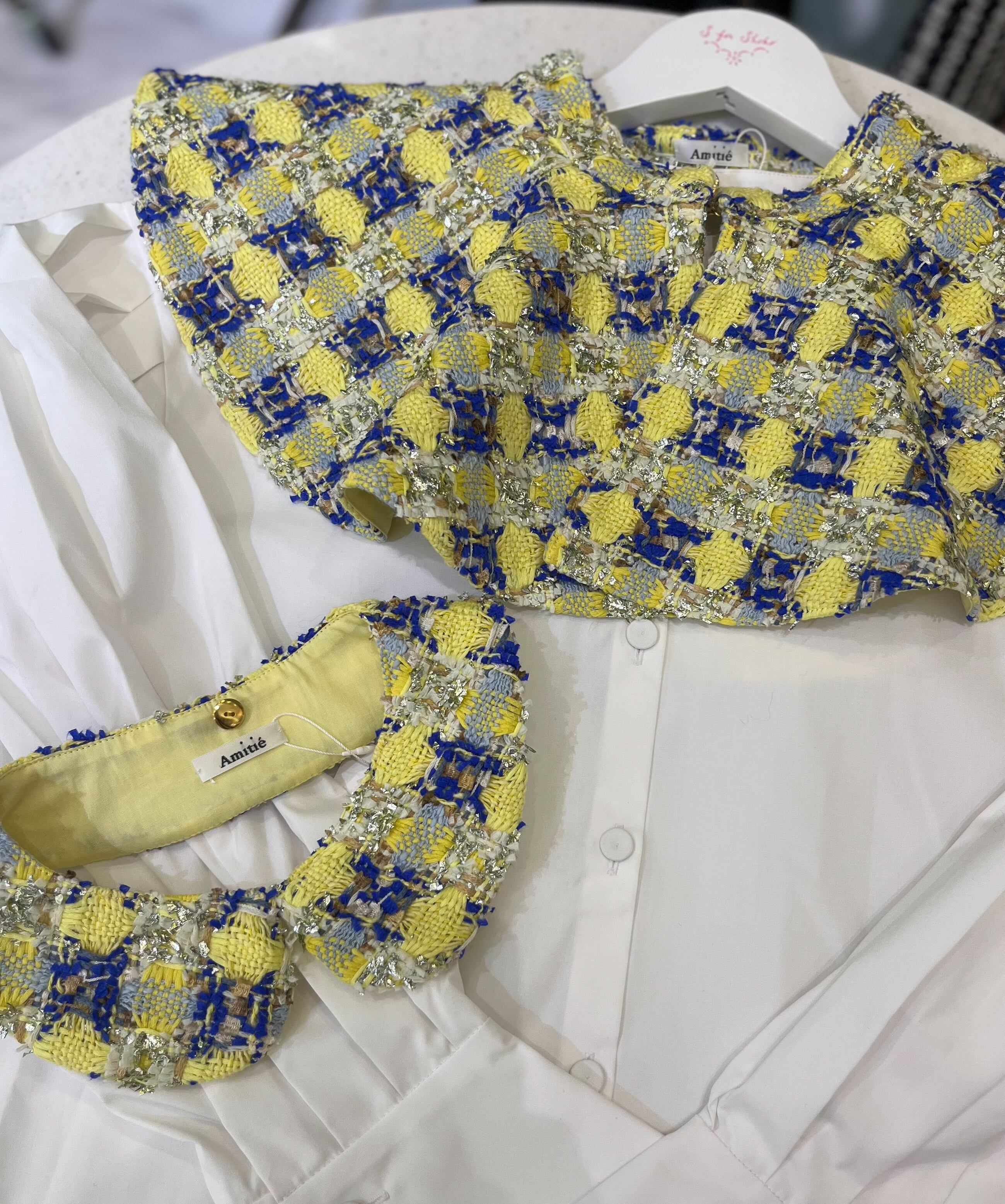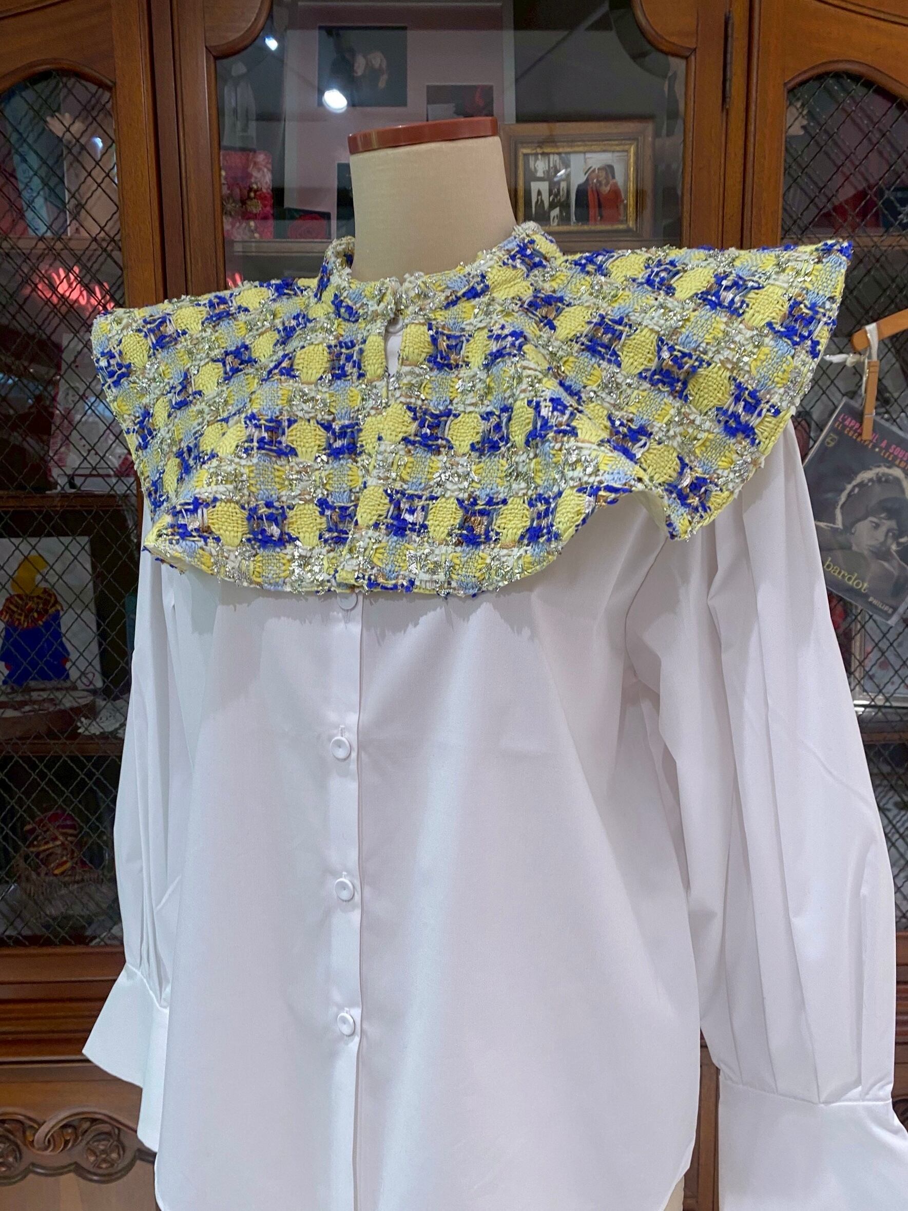 パリの工場で制作している一本一本の色の美しいツイードを襟全体に使った、贅沢な仕様の付け襟から