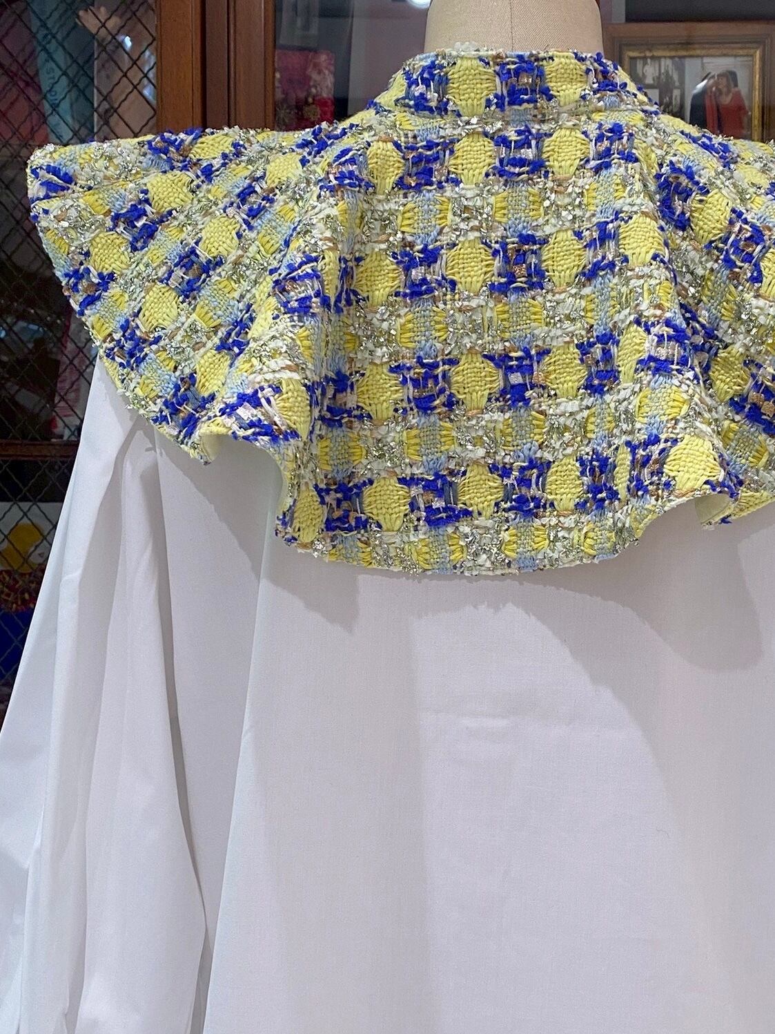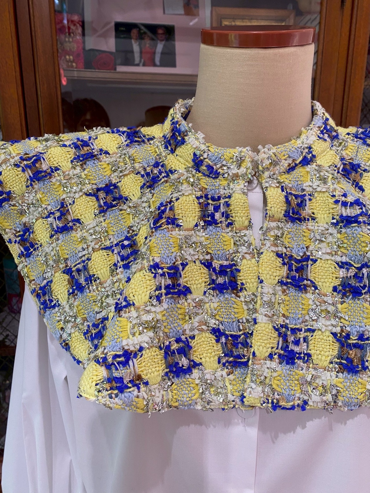新作のツイードは、柔らかいイエロー、印象的なブルー、飾り糸の白やシルバーの糸がアクセントに、水色や、ブラウンの糸がバランスよくまとめ、絶妙に表現されています。