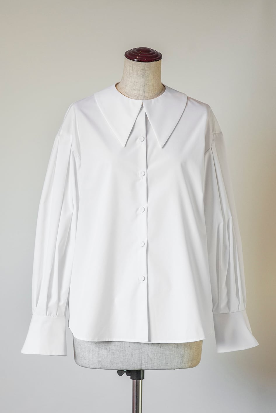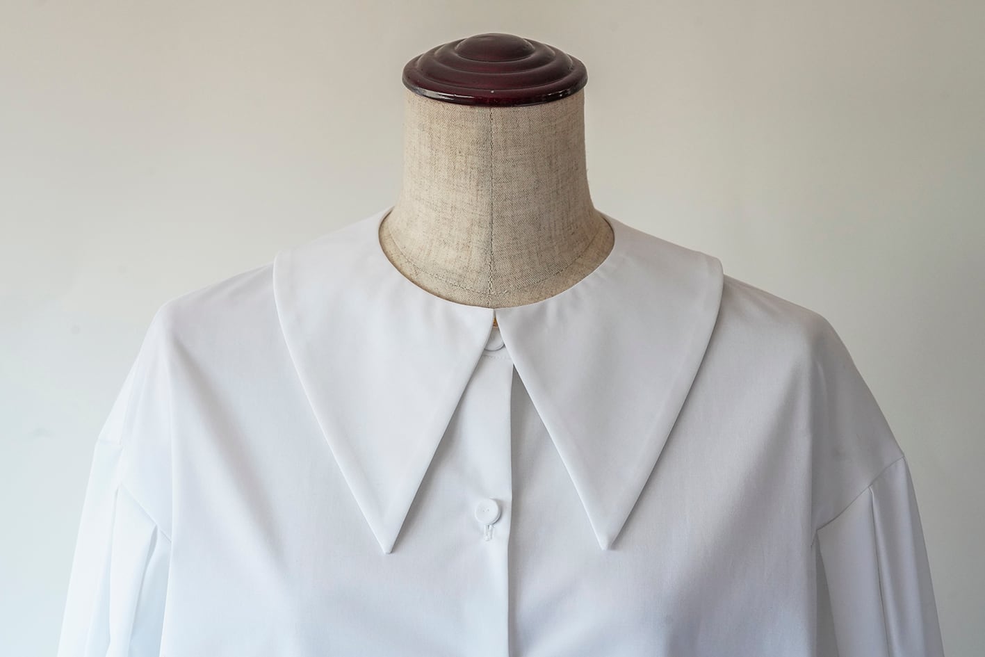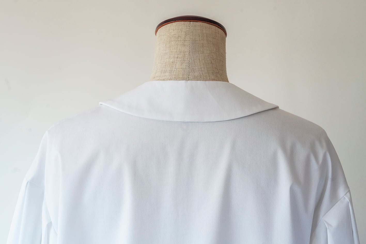 Amitiéオリジナルの付け襟です。首の後ろにある金ボタンを、専用のブラウスに装着し、前端のホックを掛けて、ズレを気にすることなくブラウスに固定して使える仕様となっています。