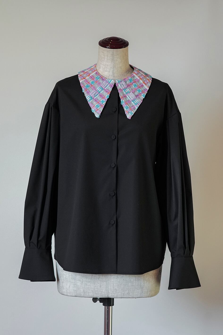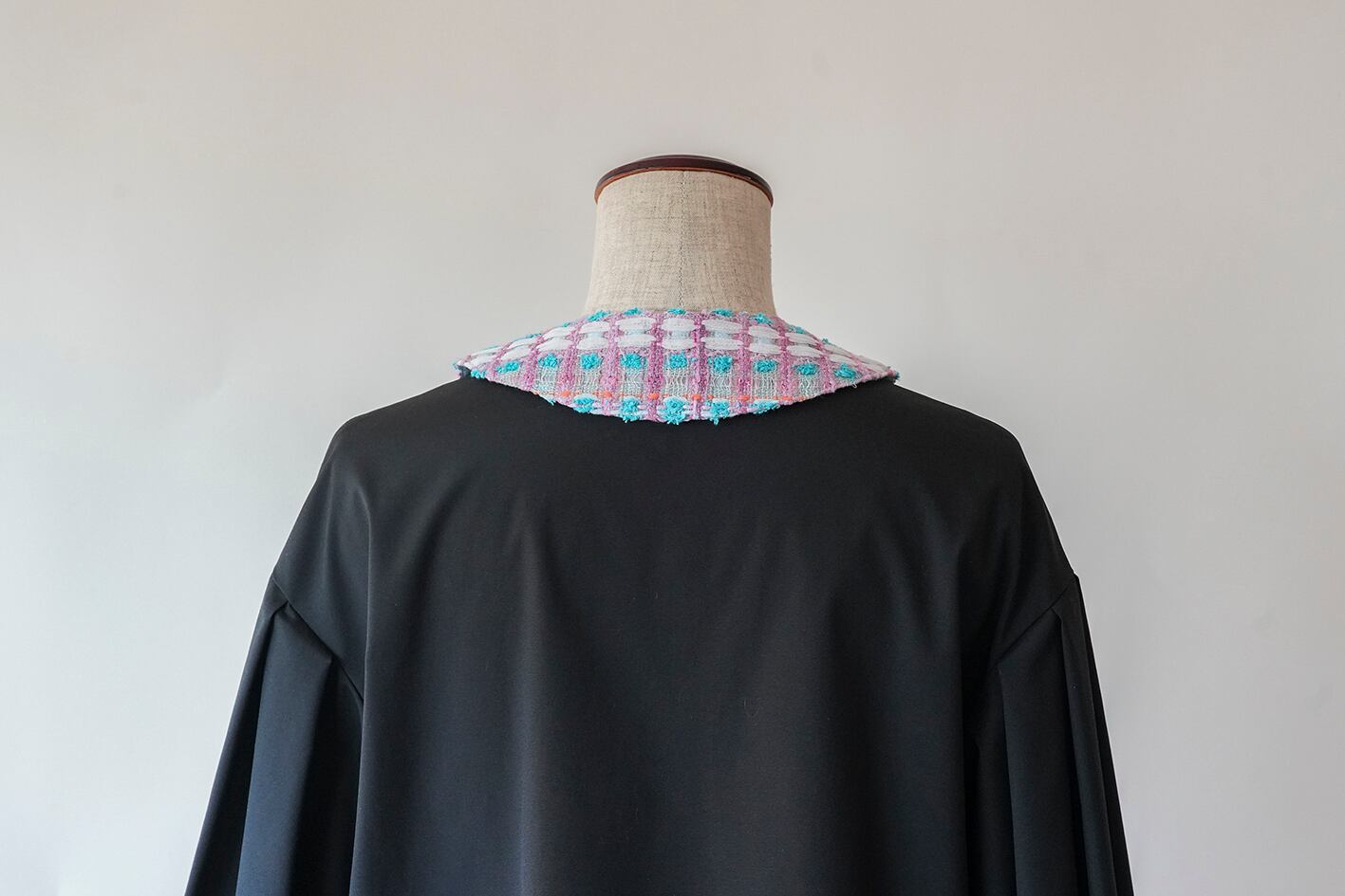 Amitiéオリジナルの付け襟です。首の後ろにある金ボタンを、専用のブラウスに装着し、前端のホックを掛けて、ズレを気にすることなくブラウスに固定して使える仕様となっています。