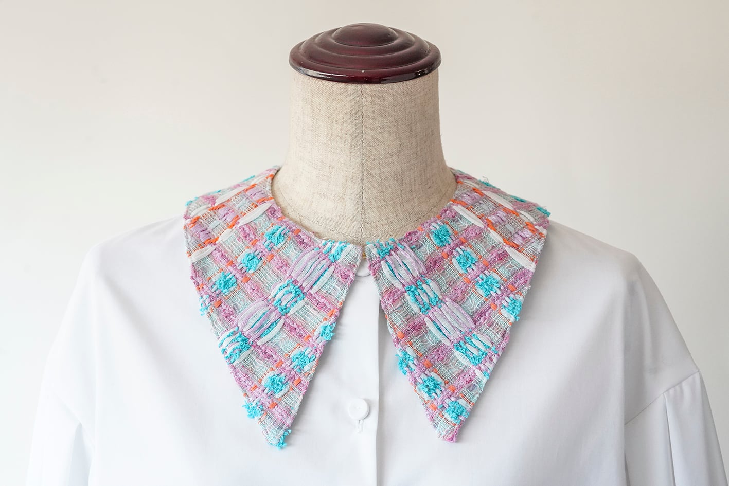 パリの工場で制作している一本一本の色の美しいツイードを襟全体に使った、贅沢な仕様の付け襟。水色と黄色がございます。